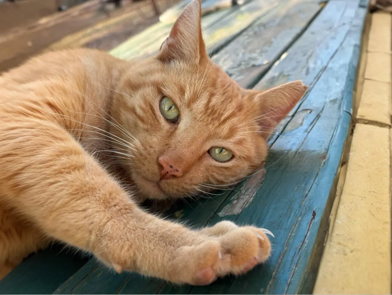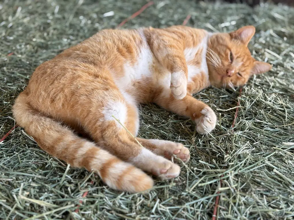 This orange tabby loves his job. He waits patiently for guests to arrive and inserts himself in all sessions. He is like a supervisor who jumps in when the horses are not doing a good enough job for his satisfaction.